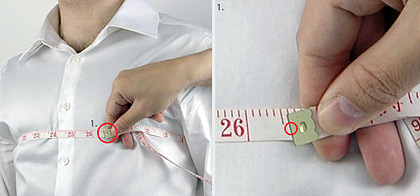Wrap the measuring tape around the chest. Keep the tape high up under the arms. Place two fingers between the chest and the tape. Stand naturally for this.