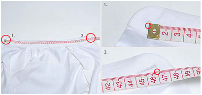 Lay the shirt flat down facing up, open the collar and spread it out. Measure from where the button is stitched to the end of the paired buttonhole. They are on opposite ends of the collar.